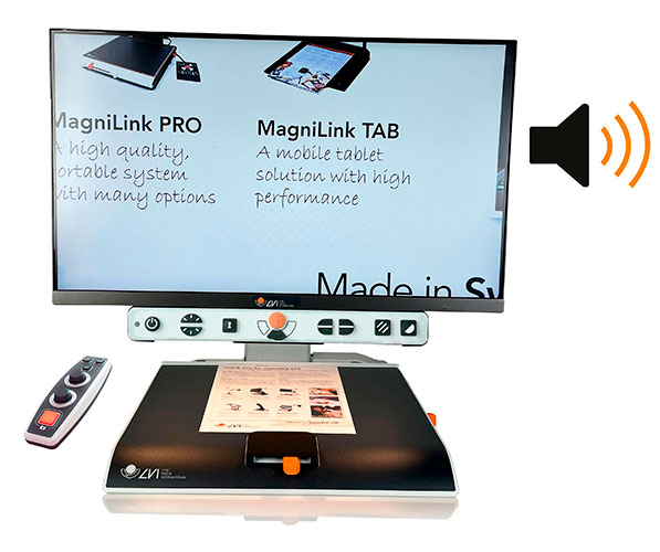 Det finnes også en versjon av MagniLink Vision med OCR hvor du får det beste fra begge verdener – et lesekamera av høy kvalitet og en lesemaskin i samme produkt. Systemet er utstyrt med en innebygd høyttaler og talefunksjonsprogramvare, slik at du kan få tekstene dine lest høyt. Dette resulterer i økt lesehastighet, utholdenhet og en mer avslappet lesing. Den leste teksten synkroniseres med teksten på skjermen. Du velger hvordan du vil at teksten skal presenteres, for eksempel ord for ord eller linje for linje.
